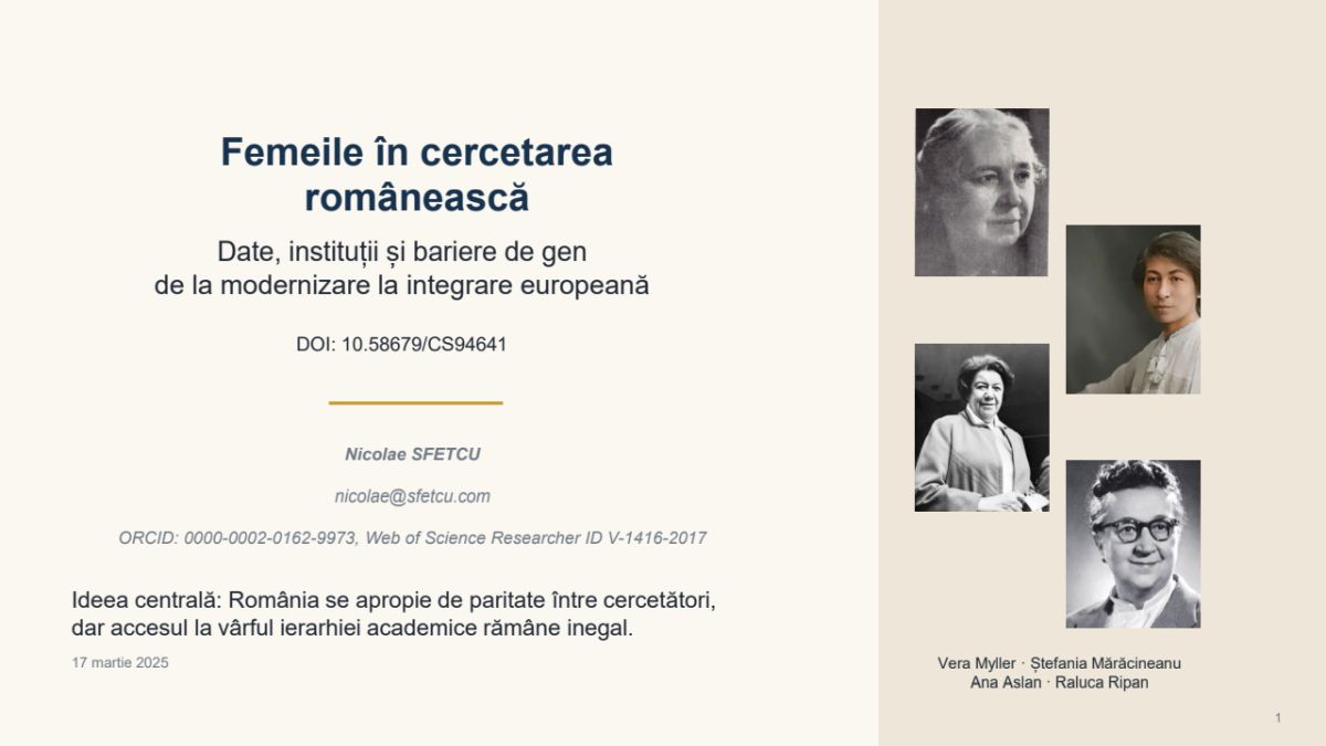 Acest articol analizează evoluția participării femeilor în cercetarea și știința din România, din secolul al XIX-lea până în prezent, combinând o revizuire istorică (cu accent pe accesul la educație și profesii), studii de caz (cercetătoare din domenii diferite) și o analiză instituțională a sistemului românesc de cercetare-dezvoltare-inovare (CDI). Concluzia centrală este că România prezintă un „paradox est-european” în raport cu multe state vest-europene: proporția femeilor între cercetători este relativ ridicată (aproape paritară), dar această paritate nu se traduce automat în acces egal la vârful ierarhiei academice și la funcțiile de decizie.